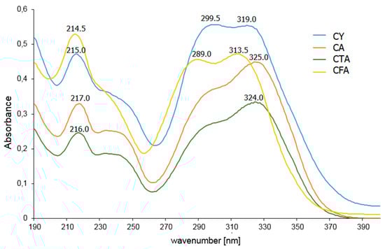 The wavelengths of maximum absorbance from the UV-VIS spectra of CFA, CA, CTA, and CY.
