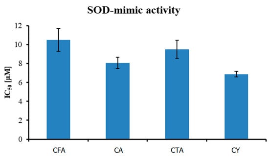 Theoretical studies (HOMO and LUMO energy calculations) show that CTA is a better electron acceptor molecule (better antioxidant) than CY. The lower the value of ∆E, the easier the electron enters the excited state in the molecule, and the better its antioxidant activity. Compounds with the lowest EA value have the highest electron transfer capacity, thus giving the highest SOD activity. According to the calculated theoretical parameters, CTA—with the highest energy of HOMO orbital (−8.52886 eV), and with the lowest values of ionization potential (8.52886 eV) and electronegativity (7.322444 eV)—should demonstrate the best antioxidant properties from the tested compounds. The antioxidant activity of CFA, CA, CTA, and CY has been investigated by hydroxyl radical (HO•) and superoxide radical (O2•) scavenging potentials (Table 6).