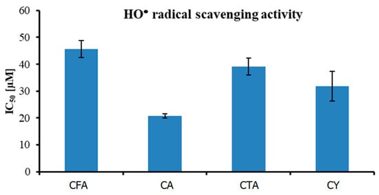 The antioxidant activity against HO• radical of four tested compounds is shown in Figure 10. IC50 value increased in the following order: CA (20.77 ± 0.86 µM) < CY (31.74 ± 5.51 µM) < CTA (39.18 ± 3.12 µM) < CFA (45.714 ± 3.15 µM). The obtained results prove the fact that CFA is the weakest antioxidant of the series. In all of the performed assays, CFA with the least complex structure was the weakest antioxidant. The presence of the two CFA moieties in the CA and CY molecules determines their high antioxidant properties. Substitution of the aromatic ring in ortho- or para-position can enhance the antioxidant activity because of the possible resonance structures leading to increased stability of the antioxidant radical formed upon the scavenging of other radicals. CFA has one ortho-dihydroxy phenyl group only, while CA and CTA are composed of two molecules of CFA. Moreover, among all the tested compounds, CY and CA have the highest number of hydroxyl groups in their structures, which may also affect their biological activity. The results of a previous study conducted by another research group are consistent with the results of the present work and showed that the antioxidant activity of CY and CA was superior to that of other tested compounds. Liu and coworkers [], evaluated the HO• free radical scavenging ability of CFA, CA, and CTA. They found that at compound concentrations of 500 µM, the degree of radical scavenging activity by CA was about 15.7% and 20.5% higher than that by CTA and CFA, respectively []. Many studies have shown that CA and CY have antibacterial, anti-inflammatory, and anti-HIV properties, which could be linked to their antioxidant activity [,].