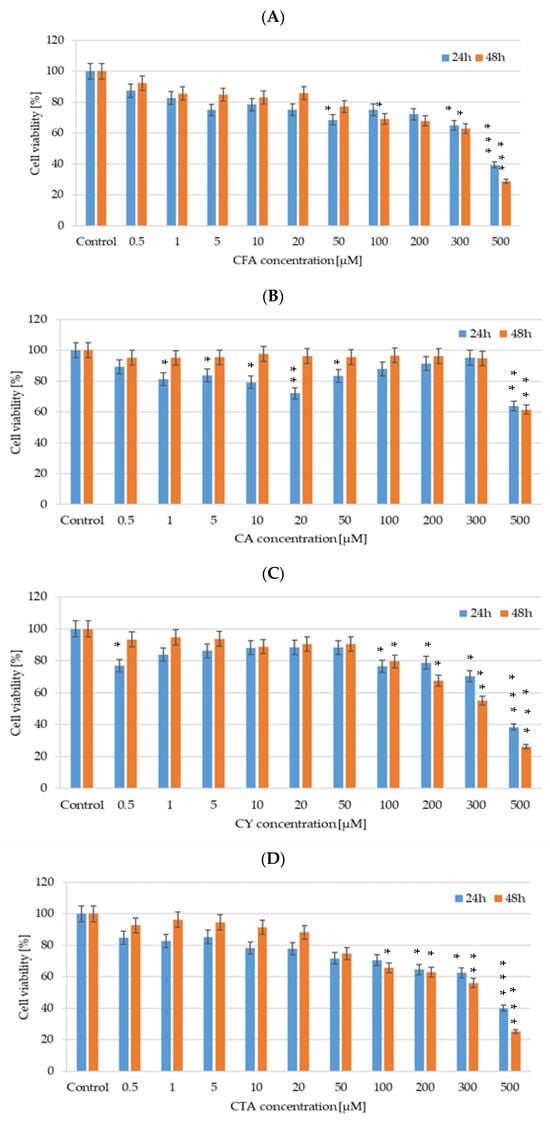 The influence of CFA, CA, CTA, and CY was studied in relation to a colorectal adenocarcinoma DLD-1 cell line, which was obtained from the American Type Culture Collection (ATCC). DLD-1 cells were cultured in DMEM (Gibco) supplemented with 10% FBS (Gibco), penicillin (100 U/mL), and streptomycin (100 μg/mL) at 37 °C in a humified atmosphere of 5% CO2 in the air. The cells viability in tested cell lines was examined at the concentrations of 0.5 µM, 1 µM, 5 µM, 10 µM, 20 µM, 50 µM, 100 µM, 200 µM, 300 µM, and 500 µM for every studied compound.