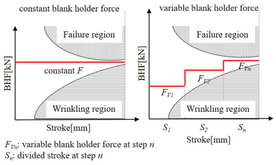 Historically, a constant blank holder force (CBHF) was used in stamping processes, but this method usually results in material flow issues, causing wrinkling at low BHF and failures at high BHF, while increased tension and reduced bending moments might also worsen problems like springback [7,8]. The VBHF technique addresses these issues by allowing for the spatially and temporally variable forces on the blank holder, thus enhancing the control of the material flow [9,10]. The BHF trajectory is optimized to ensure smooth material flow, preventing local thinning and wrinkling [10,11]; a related basic schematic diagram is shown in Figure 1. Moreover, appropriate lubrication could increase sheet material flow to reduce defects [12]. Yet, excessively low friction might result in unintended issues like tearing or excessive thinning [13,14]. Moreover, optimizing stamping quality requires precise adjustment of the friction coefficient, which could be influenced by lubricant application position. However, determining the lubrication application position is obtained through continuous trial and error.