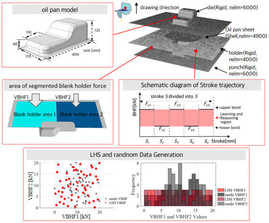 The VBHF was applied while the punch descended at a rate of 300 mm/s. The total stroke was separated by five sub-stroke steps, each maintaining a constant BHF along its trajectory. Then, the VBHF of each sub-stroke step was used as design variables. The delimited lower and upper bounds of the design variables were defined as 10 kN and 25 kN, and the maximum total magnitude of the two regions was defined as 30 kN for the design constant. The optimal sampling points were created by using the Latin hypercube design (LHD) referenced from [18,19], upon which a deep neural network (DNN) model was established to study the relationship between variable blank holder force (VBHF) and multi-defects in the stamping process. Considering the 10-dimensional design space is difficult to visualize, we illustrated the LHD sampling scheme shown in Figure 3 by extracting 30 sample points in a two-dimensional design space.