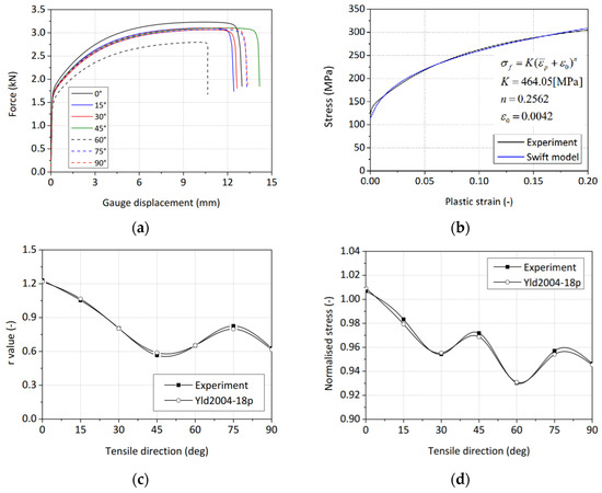 Anisotropic material characteristics of AA6014-T4 alloy of (a) force-displacement curves, (b) true stress–strain curves, (c) R-value data, and (d) anisotropy calibration results.