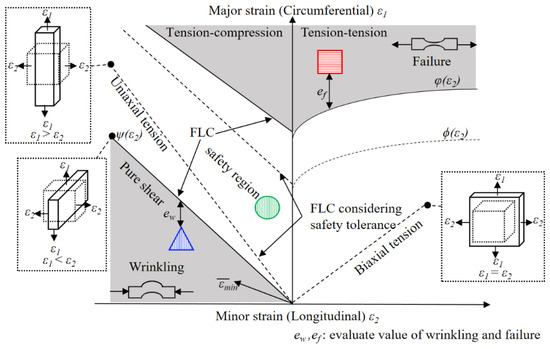 Additionally, the estimation of material processability is crucial in assessing the workability of sheet metals and identifying product issues in forming processes. The Forming Limit Diagram (FLD) was commonly utilized in experimental settings to assess the formability of manufactured components [10,15,17,18,19,23,24]. Keeler and Backofen [38] and Goodwin [39] are acknowledged as trailblazers in the initial development of the FLD. Figure 2a,b present a schematic representation of the FLD and illustrate various defects and delineate a safe forming zone, respectively. Typically, FLD graphically represents the major in-plane strain and the minor in-plane strain on the vertical or horizontal axis. Moreover, the Forming Limit Curve (FLC) is a delimitation on the FLD that divides between safe and unsafe levels of strains. However, accurately determining this curve requires understanding the material’s behavior under various conditions, in which the variability in these factors makes the FLC calculation a sophisticated process requiring precise experimental data and advanced mathematical modeling. Moreover, creating FLDs for specific materials and thicknesses requires expensive experiments, causing challenges for most producers and those using diverse materials.