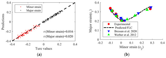 (a) Accuracy of minor strain and major strain distribution and (b) predicted FLDs for AA6014-T4 for using machine learning model and experiment data collected from literature [59,60] to validate proposed model.