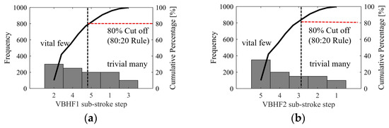 Pareto chart of types of VBHF trajectory sub-stroke step frequencies of trajectories of (a) VBHF1 and (b) VBHF2, vital few sub-stroke steps that warrant most attention are disparate as sub-stroke steps 2 and 4 and sub-stroke steps 5 and 4, respectively.
