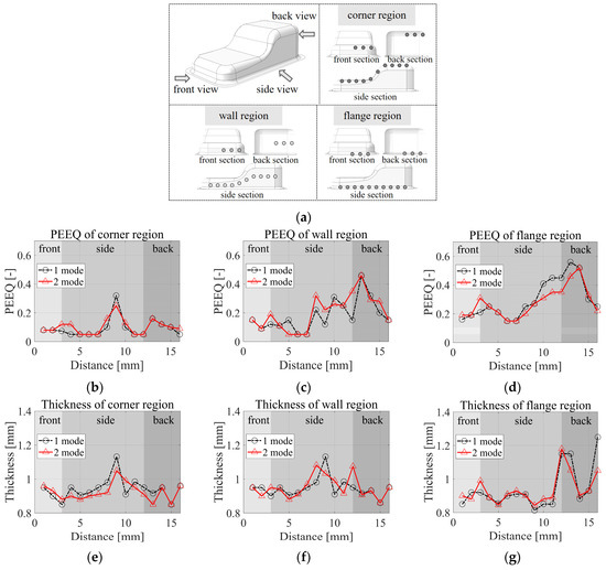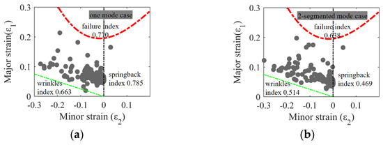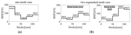 Figure 14 depicts the optimal VBHF trajectories for different configurations: (a) the one-mode case and (b) the two-segmented mode case. In the one-mode case, the blank holder area was treated as a unified whole, whereas in the two-segmented mode case, it was divided into two distinct sections: Blank Holder Area 1 and Blank Holder Area 2. It is important to note that with a constraint of the total VBHF amount below 300 KN, the two-segmented mode case is reduced by 60.51 kN, which is 14.07% of the total reduction in the total BHF of one mode case.