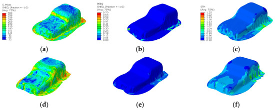 When the defect optimization results are compared with the training set average values, all defects including failure, wrinkling, and springback are reduced within the Pareto-optimal set range. As shown in Figure 12a, in the case of two-segmented mode VBHF case application, the total aggregate quantity of VBHF is reduced by 14.07%, and when compared with the average value of training sets, the improvements of 18.89%, 13.59%, and 14.26% are achieved in failure, wrinkling, and springback, respectively. Meanwhile, compared to the average value of the objective function of the non-segmented and two-segmented training sets, the two-segmented case showed better performance in terms of total value by 12.62%.