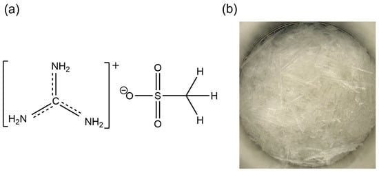 The chemical structure of [Gdm][OMs] (a) and the photograph of its crystals (b).