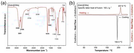 The DSC thermogram of [Gdm][OMs] is shown in Figure 2b. The experimental conditions and results of DSC measurements in comparison with the literature [15,16] for [Gdm][OMs] are summarized in Table 2. [Gdm][OMs] exhibits distinct melting and solidification peaks during the heating and cooling cycles. It shows a very sharp and symmetrical endothermic melting peak with an accurate melting point (Tm) of 207.6 °C and a specific latent heat of fusion of 183.0 J g−1 (Figure 2b), indicating the high purity of as-prepared [Gdm][OMs]. The values of Tm and ΔfusH agree well with the values reported by MacFarlane et al. (Tm = 208 ± 1 °C; ΔfusH = 190 ± 9.5 J g−1) [15,16].