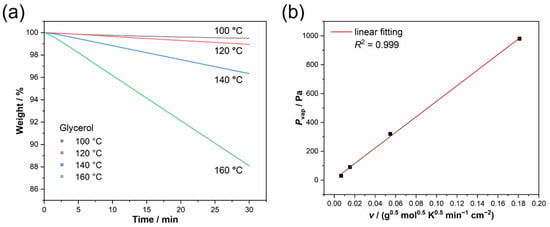 Glycerol is used as the calibrator for the isothermogravimetric method to determine the constant kvap (Equation (2)). Based on the IGA traces of glycerol at different temperatures (Figure 3a), the distinct mass loss rates of glycerol, the corresponding coefficient of determination R2 (all of them exceeds 0.98) for linear regression, and the values of v were obtained and are listed in Table 3. Using the reported vapor pressure data of glycerol [45,46], the curve of Pvap vs. v is plotted in Figure 3b. Obviously, there is a linear relationship between Pvap and v, and the constant kvap was evaluated from the slope as 5397 Pa min cm2 g−0.5 mol−0.5 K−0.5, with an excellent coefficient of determination (R2) of 0.999.