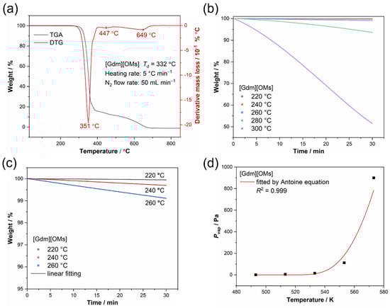 (a) TGA trace and DTG curve of [Gdm][OMs]; (b) IGA traces of [Gdm][OMs] at different temperatures; (c) Selected IGA traces and the linear fitting curves at 220 °C, 240 °C and 260 °C for [Gdm][OMs]; (d) The fitting curve using Antoine equation for [Gdm][OMs].