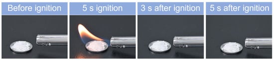 Finally, the flammability test (Figure 6) indicates that [Gdm][OMs] cannot be ignited after 5 s of combustion in air and will not explode when exposed to open flames, either. This demonstrates that [Gdm][OMs] is non-flammable and has excellent thermal safety.