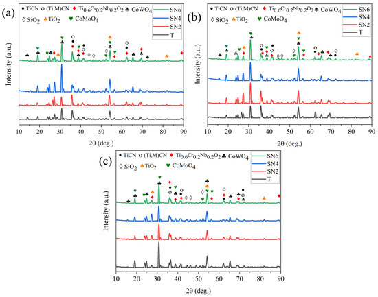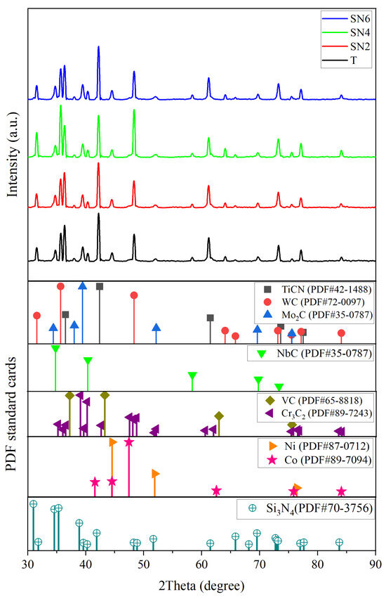 According to the phase analysis, Figure 1 presents the XRD patterns of the ball-milled powders prior to sintering, confirming the presence of Ti(C,N), WC, Mo2C, NbC, VC, Cr3C2, Ni, Co, and Si3N4 as starting powders based on the JCPDS numbers 42-1488, 72-0097, 35-0787, 89-3830, 65-8818, 89-7243, 87-0712, 89-7094, and 70-3756, respectively. In addition, no further phases were created. Milling was used to ensure that the particles were mixed uniformly.