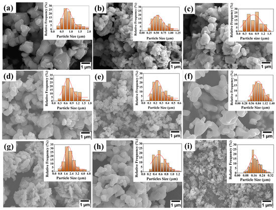 Microscopic morphology and particle size distribution of the initial raw powders: (a) Ti(C0.5N0.5), (b) WC, (c) Mo2C, (d) NbC, (e) VC, (f) Cr3C2, (g) Ni, (h) Co, and (i) Si3N4.