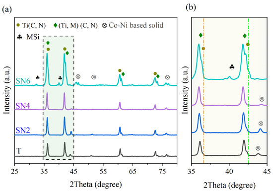 XRD of sintered cermets with the addition of different Si3N4 contents: (a) ranging from 2 = 25° to 80° and (b) enlarged XRD patterns ranging from 2 = 35° to 45°.