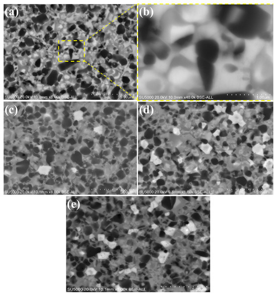 Scanning Electron Microscopy (SEM) images depicting Ti(C,N)-based cermets sintered with different contents of Si3N4: (a) Ti(C,N) + 0wt.%Si3N4, (b) enlarged view of Ti(C,N) + 0wt.%Si3N4, (c) Ti(C,N) + 2wt.%Si3N4, (d) Ti(C,N) + 4wt.%Si3N4, (e) Ti(C,N) + 6wt.%Si3N4.