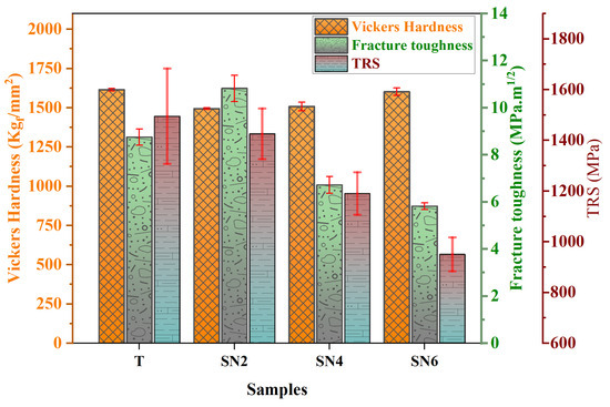 Mechanical properties of Ti(C,N)-based cermet with different Si3N4 contents. Error bars represent the standard deviation (SD).