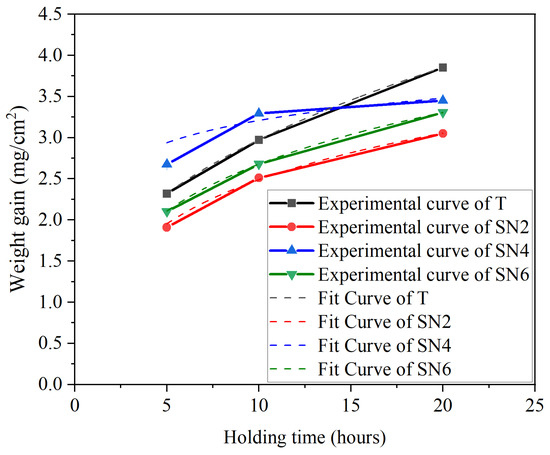 where Δm represents the increase in mass, As denotes the surface area, Kp stands for the oxidation rate constant, t is the oxidation time, n represents the oxidation exponent, and c is a constant term. The results of the fitting process are illustrated in Figure 8. Table 3 displays the values of Kp, c, and n for all the fitted curves, with the coefficient of determination (R2) indicating the quality of the fit.