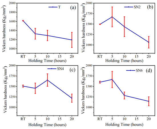 Vickers hardness of Ti(C,N)-based cermets after oxidation at 800 °C: (a) 0 wt.%Si3N4, (b) 2 wt.%Si3N4, (c) 4 wt.%Si3N4, (d) 6 wt.%Si3N4. Error bars represent the standard deviation (SD).