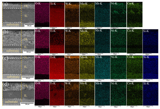 BSE/EDS patterns of cross-sections of Ti(C,N)-based cermets oxidized at 800 °C for 20 h with varying additions of Si3N4: (a) 0 wt.%Si3N4, (b) 2 wt.%Si3N4, (c) 4 wt.%Si3N4, (d) 6 wt.%Si3N4. The scanned area was between two orange dotted lines, and the oxide layers were separated by white dotted lines.