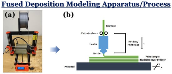 Out of the existing 3D printing methods, fused deposition modeling (FDM) is one technique that has arguably seen the greatest amount of industrial usage [17,18,19,20]. Also known as fused filament fabrication (FFF), the FDM process involves the controlled heating and extrusion of plastic filaments through a small nozzle to create a physical part [21]. With the plastic leaves through the nozzle, it is in a molten-like state beyond the material’s glass transition temperature [22]. At the start of the FDM process, molten plastic is placed onto a heated bed as the base material. After solidification, a second layer of molten plastic is extruded and added above/to the side of the first layer. By following the pre-set g-code program, the process continues until the final part is complete [17].