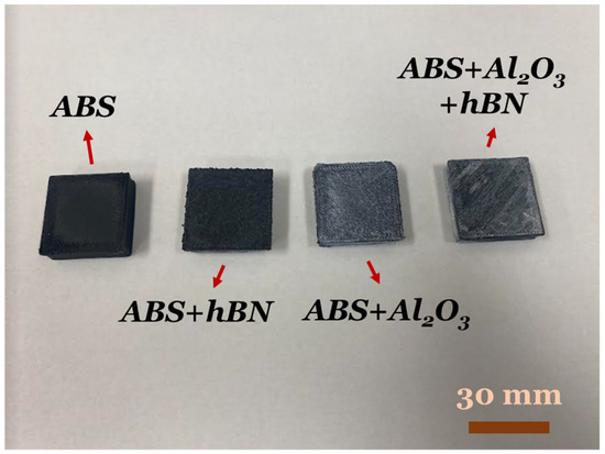 A visual representation of the ABS, ABS + Al2O3, ABS + hBN, and ABS + hBN + Al2O3 specimens used in this work.