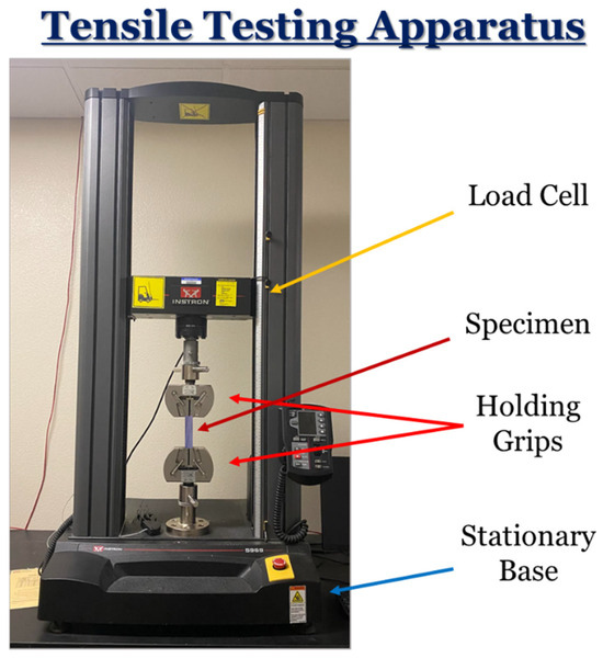 Tensile tests were completed to determine the mean ultimate tensile stress (UTS) of the four sample sets. The intention of performing these tests was to provide additional support for the tribological mechanisms in this work. In particular, the quality of interparticle bonding can be quantifiably obtained, which can provide useful insights and correlations to the tribological findings. However, in pure mechanical applications, Al2O3 and/or hBN reinforcements are added. All tension tests were performed on an Instron Model 3366 Dual Column Uniaxial Material Testing Machine (Instron, Norwood, MA, USA) (Figure 4) with 0.057 μm displacement precision, 0.001 N force accuracy, and 10 kN load force capacity. All samples were secured in the jaws of mechanical wedge action grips, and tension tests were run at a strain rate of 6.5 × 10−4 s−1 with an associated grip speed of 4.46 mm/min. The testing environment was set to room temperature (~25 °C). Each tension sample was then pulled until fracturing occurred. To ensure repeatability, three printed dog bones of each specimen were tested and averaged, with the standard deviation scale bar representing the findings from all three tests. These samples were designed as per the ASTM D638 standard. The results from these tests were used to determine the mean ultimate stress, mean yield stress, and effective modulus of elasticity along the longitudinal loading direction. Furthermore, the modulus of toughness was also determined in this analysis by integrating the area beneath the stress–strain curve.