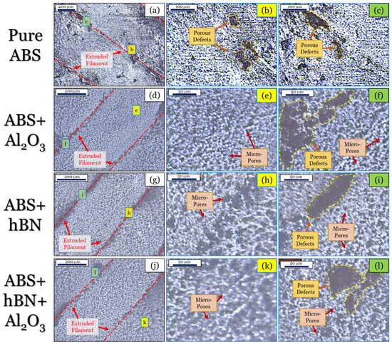 Optical micrographs of the (a–c) ABS, (d–f) ABS + Al2O3, (g–i) ABS + hBN, and (j–l) ABS + hBN + Al2O3 surfaces.
