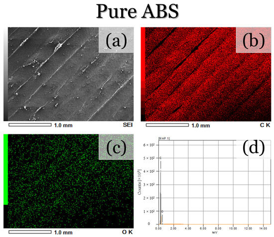 (a) SEM and (b–d) areal EDS map micrographs/EDS spectra of the ABS-printed surface.