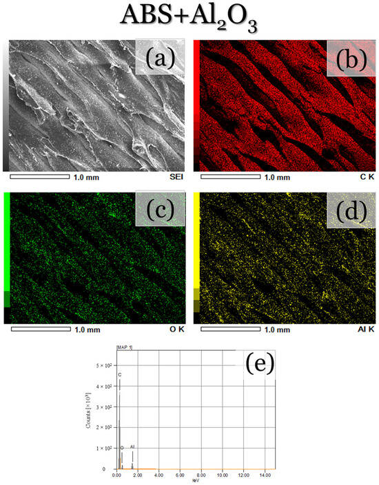 (a) SEM and (b–e) areal EDS map micrographs/EDS spectra of the ABS + Al2O3-printed surface.
