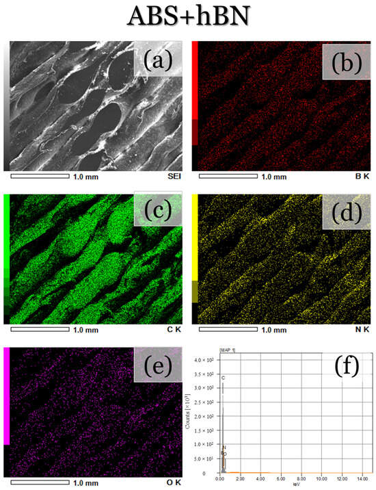 (a) SEM and (b–f) areal EDS map micrographs/EDS spectra of the ABS + hBN-printed surface.