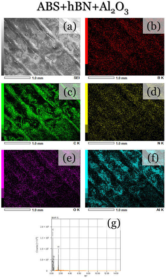 (a) SEM and (b–g) areal EDS map micrographs/EDS spectra of the ABS + hBN + Al2O3-printed surface.