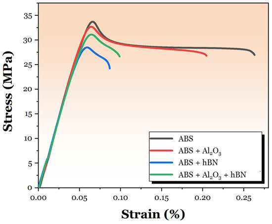The tensile stress–strain plots of the ABS, ABS + Al2O3, ABS + hBN, and ABS + hBN + Al2O3 specimens.