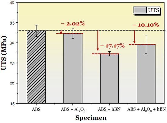 The ultimate tensile strength (UTS) from the tensile tests was also obtained, as shown in Figure 12. It can be seen that, across all composite specimens, the UTS decreased compared to the non-composite ABS specimen. In particular, for the ABS + Al2O3 specimen, there was a 2.02% decrease, whereas the ABS + hBN and ABS + Al2O3 + hBN specimens decreased by 17.17% and 10.10%.