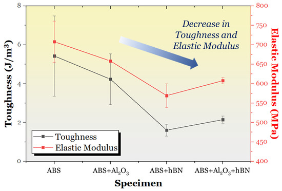 The evolution of toughness and elastic modulus for the ABS, ABS + Al2O3, ABS + hBN, and ABS + hBN + Al2O3 specimens.