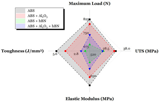 A culmination in the mechanical characteristics of ABS with and without reinforcement additions is shown in Figure 14. More specifically, in this figure, the maximum load, toughness, UTS, and elastic modulus of all specimens are shown. The intention of creating such a figure is to understand the implications of reinforcement additions to the mechanical strength of 3D-printed ABS composites. It is clear to see that the area of the plot decreases once reinforcement is added, indicating a reduction in mechanical strength. Although Al2O3 does not have as much of a detrimental effect as hBN, the addition of these reinforcements between each ABS layer negatively affects the cohesion of each ABS layer. Overall, these findings indicate that adding an interlayer reinforcement is not a feasible method to improve ABS mechanical strength. Rather, the addition of interlayer reinforcement increases the likelihood of fracturing due to the loss of molecular orientation and the appearance of voids [67].