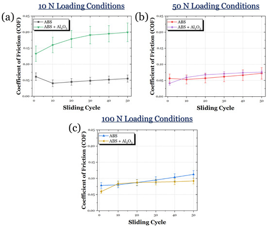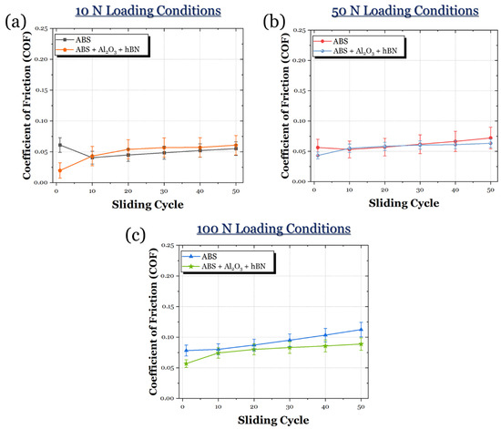 The average COF of the ABS and ABS + Al2O3 + hBN specimens in (a) 10 N, (b) 50 N, and (c) 100 N loading conditions.