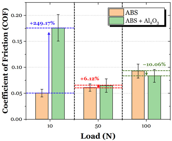The average coefficient of friction (COF) values of the ABS and ABS + Al2O3 specimens are shown in Figure 16. For the 10 N loading condition, the ABS + Al2O3 specimen had a 249.17% increase in friction. However, as the load increased, the difference in COF also decreased. In particular, for the 50 N condition, the Al2O3 specimen had a 6.12% increase in friction, whereas for the 100 N condition, the friction decreased by 10.06%. It is interesting to note that unlike the ABS specimen, which has a gradual increase in friction as a function of load (which can be attributed to the increase in contact area during sliding), the COF of the ABS + Al2O3 specimen decreases, then slightly increases again. These findings suggest that Al2O3 has some influence on the frictional characteristics in varying loading conditions.