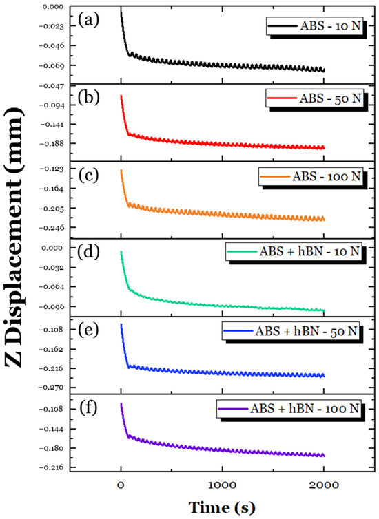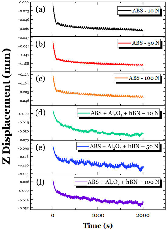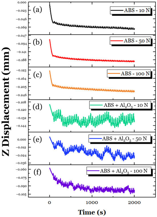 The variation in Z-displacement for the ABS specimen at (a) 10 N, (b) 50 N, and (c) 100 N loading conditions; the variation in Z-displacement for the ABS + Al2O3 specimen at (d) 10 N, (e) 50 N, and (f) 100 N loading conditions.
