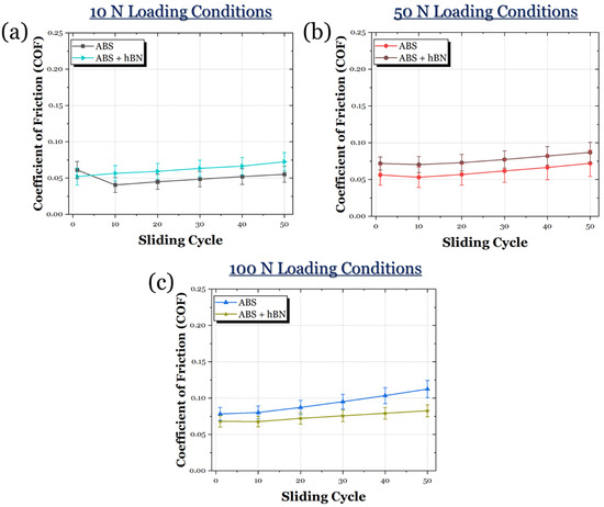 The average COF of the ABS and ABS + hBN specimens in (a) 10 N, (b) 50 N, and (c) 100 N loading conditions.