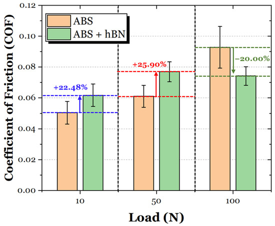 The average COF of the ABS and ABS + hBN specimens in 10 N, 50 N, and 100 N loading conditions.