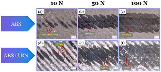 Optical micrographs of the (a–c) ABS and (d–f) ABS + hBN wear tracks after tribo-sliding.