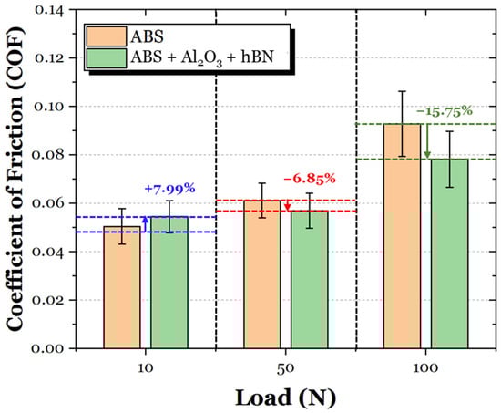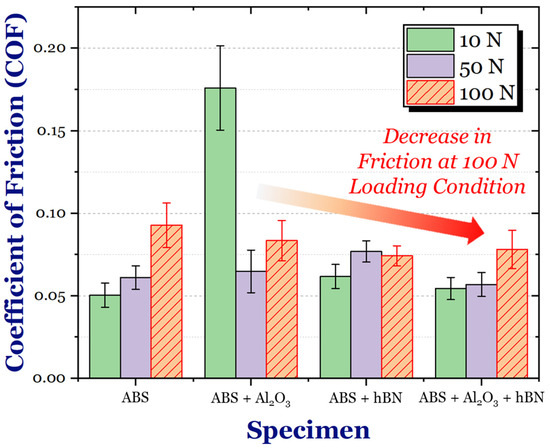 The average COF of the ABS and ABS + Al2O3 + hBN specimens in 10 N, 50 N, and 100 N loading conditions.