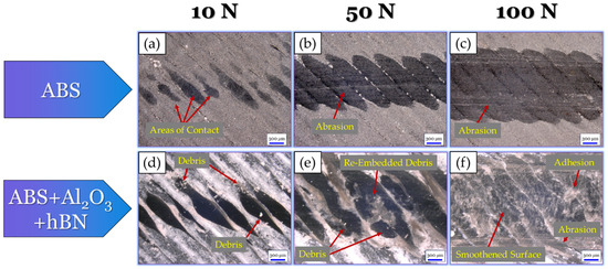 Optical micrographs of the (a–c) ABS and (d–f) ABS + Al2O3 + hBN wear tracks after tribo-sliding.