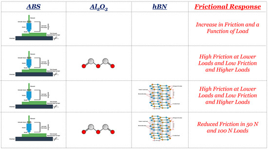 Based on this information, the purpose of this work is to understand the influence of Al2O3 and hBN on the tribological performance of FDM’d ABS. Evaluations of ABS’s structural features and mechanical properties will be made to provide supporting evidence for the tribological mechanisms that take place. Particularly, the frictional response can be assessed. To achieve this, this work focuses on the independent and simultaneous addition of Al2O3 and hBN to the ABS matrix through a novel in situ spraying technique that eliminates the need for matrix-to-filler mixing. The intention of adding Al2O3 and hBN is to understand the interactions of matrix reinforcement (hard and soft) to the FDM-printed composite. It is expected that Al2O3 provides a load-bearing type of effect, whereas hBN acts as a solid lubricant. When combined, the combination of these features reduces the influence of direct tribological loads, which, in turn, reduces the frictional response. In doing so, moving mechanical assembly components in applications such as textile drying machines, bushings, and gears, which oftentimes cannot use external lubricants, can benefit due to the self-replenishable and frictional-reducing characteristics of the proposed FDM components [25,39]. Through this work, key insights into the role of these in situ-sprayed composites can be determined, which can help to further the scientific advancement of the FDM field.