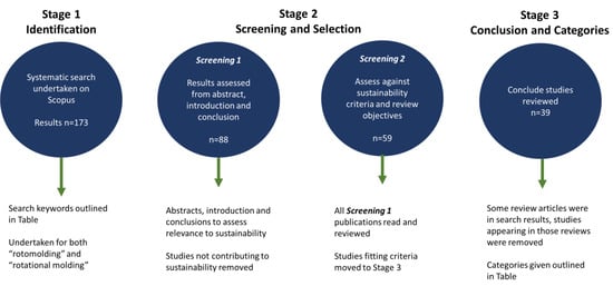 - The current state-of-the-art rotational moulding literature contributing to sustainability undertaken with an approach comparable to the PRISMA literature review method heavily focused upon materials and composite characterisation and assessment. From retrieved studies, 75% were categorised as materials, 9% as the process, 9% as the process and modelling and 4 as sustainable applications. The introduction of further search engines, which includes non-academic publications, such as Google Scholar, might be beneficial for future reviews; similarly, the introduction of conference papers would add some interesting insights. However, this was not addressed within this work due to the difficulties in obtaining the full papers for such works, as they are not usually easily accessible.