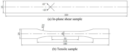 The in-plane shear test of the UHMWPE fiber 2UD samples was conducted in accordance with ASTMD3518. The schematic diagram of the in-plane shear sample is shown in Figure 2, and the required samples were obtained using a cold processing method. The testing platform used was the 5969H universal material testing machine, produced by the American company Instron in 2016, with a loading rate of 60 mm/min.