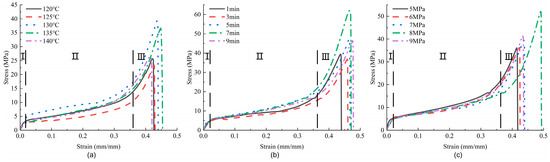 Observing the curves of the three groups, Figure 4a shows the greatest degree of dispersion, being more consistent only in the first stage. This suggests that changes in hot-pressing temperature not only alter the bond strength between the thread and the glue in the samples but may also cause varying degrees of damage to the fibers in the samples, leading to significant differences in the stress–strain curves under different hot-pressing temperatures. The in-plane shear performance of this group of samples is better at 130 °C and 135 °C. The fluctuations of the curve in Figure 4b have reduced, with the first stage almost completely overlapping. At 7 min, the peak of the curve significantly increases, obtaining better in-plane shear performance. The curves in Figure 4c showed a high degree of consistency, with strain and peak values significantly increasing at 8 MPa, indicating the best in-plane shear performance during the test. The ultimate strain of the curves reflects the samples’ elastic properties, which change with the hot-pressing parameters. As the hot-pressing parameters increase, the strain of the three groups of curves first increases and then decreases. The size of the enclosed area formed by the curves and the x-axis reflects the amount of energy absorbed by the samples, revealing a trend similar to the stress.