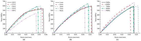 Tensile stress–strain curves of samples under different hot-pressing parameters: (a) hot-pressing time is 1 min, hot-pressing pressure is 7 MPa; (b) hot-pressing temperature is 130 °C, hot-pressing pressure is 7 MPa; (c) hot-pressing temperature is 130 °C, hot-pressing time is 1 min.